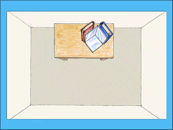 Sedan ställer vi en spegel på var sida om den första spegeln så att speglarna möts i hörnet. Låt dessa speglar luta mot klossar eller böcker för att stå stadigt.