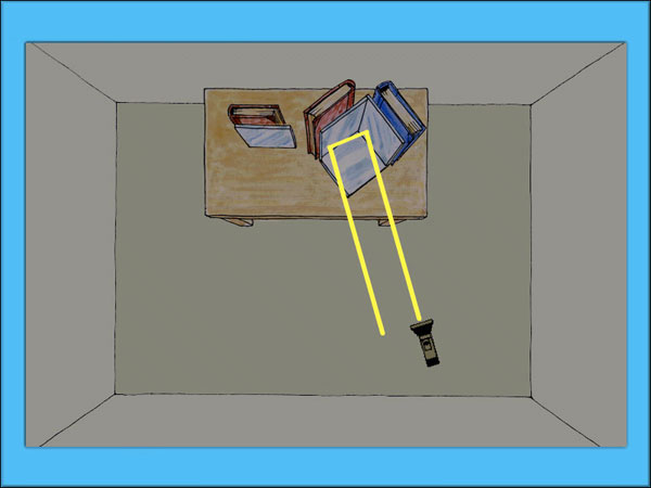 Nu är det dags att använda lampan så vi får samma ljus tillbaka som till exempel en bilförare får. Vi ställer oss i andra änden av rummet och lyser på de tre speglarna i vinkel. Då ser vi att ljuset studsar tillbaka.